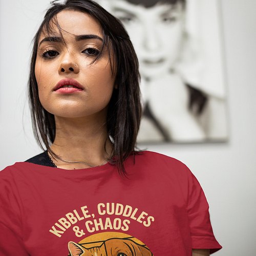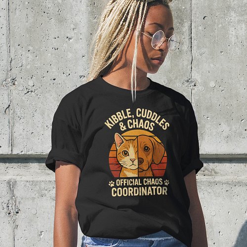 Kibble Cuddles & Chaos T-Shirt — Retro Split Cat Dog Design — Pet Mom Dad Tee
